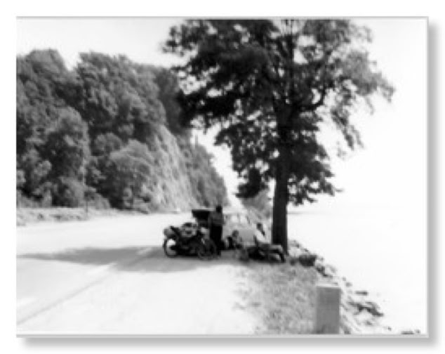 De weg voert een uurtje later ter hoogte van Aix Les Bains langs een of ander meertje met een moeilijke Franse naam en potver, daar staat de Peu met open kofferbak en daarnaast - op de kampeerstoeltjes - de hele familie plus vriendin te picknicken!. Wel verdraaid! Wat een verrassing voor allemaal! Mijn moeder knuffelt me alsof ze me al doodgewaand had, om over mijn vriendin maar te zwijgen. En mijn vader komt niet verder dan een almaar “Sjonge, kerel toch!“ en lijkt een traan weg te pinken. Maar ja. Dan moeten we allemaal toch weer verder. Terwijl de Peu in de verte verdwijnt zwaai ik vanaf de Puch nog een paar keer hevig. Voor de eerste keer deze reis voel ik me een beetje alleen.