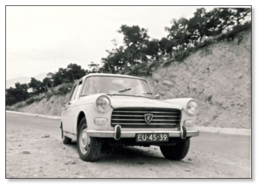 Niet veel later zet ik de Plof rond half één langs de weg wederom tegen een boom en zit met de rug tegen het frame een boterham te eten. Tot mijn onuitsprekelijke verbazing komt daar in de verte een witte Peugeot 404 aan (dat kwam overigens wel vaker voor, daar in Frankrijk). Terwijl hij voorbij rijdt zie ik mijn moeder op de voorbank met haar hoofd tegen de deurspijl slapend en mijn vriendinnetje Joleen achterin gepropt tussen mijn broer en mijn zus. Als ik ze herken spring ik op en begin te gillen en te zwaaien. Maar in een zucht zijn ze voorbij zonder mij gezien te hebben. Van een mobiele telefoon hebben we op dat moment uiteraard nog geen benul. Boterham richting vogeltjes en als een gek - tegen beter weten in - achter de Peu aan. Nou kun je veel van een Puch zeggen, maar zelfs met een doorgeslagen potje verliest ie toch echt een race tegen een Peugeot 404. Maar ach, vol gas is vol gas en meer dan vol gas had er de hele reis ook niet in gezeten.