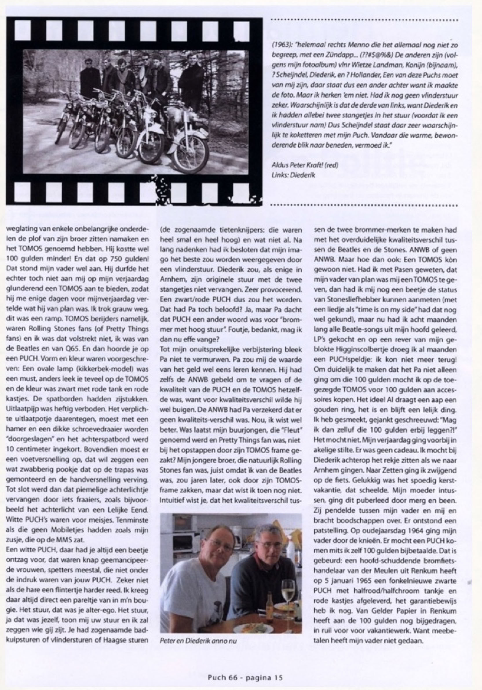 Zomer 1966. Ik ben 18 jaar en vorig jaar december heb heb ik dan voor mijn verjaardag eindelijk de de door mijn Pa een jaar daarvoor beloofde Puch gekregen. Zwart met een rode tank en rode kastjes. Het is zomer en mijn ouders gaan met mijn broertje Ernst en zus Christien met de witte Peugeot 404 (met van die mooie kleine vleugeltjes boven de achterlichten) op vakantie naar Frankrijk. Het doel is Petichet aan het meer van Laffrey, een kilometer of 30 onder Grenoble.
