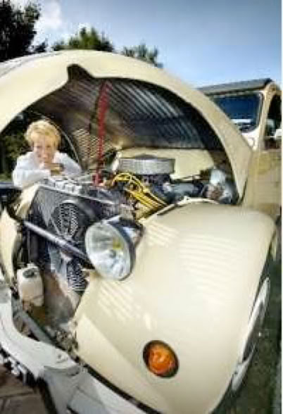 Binnen is goed te zien dat het gebruikelijke interieur niet gehandhaafd kon blijven door de maat van de motor en de automatische drietrapsbak. Het orginele schutbord en de binnenschermen zijn verplaatst, zodat de bestuurster wonderlijk ver naar achteren zit in haar racekuip met zespunts rally-gordels. Daarachter ligt de accu en de tank met een inhoud van veertig liter, die vaker dan wenselijk moet worden bijgevuld. Josien: "Als je er een beetje op let is een benzineverbruik van 1 op 4 haalbaar."